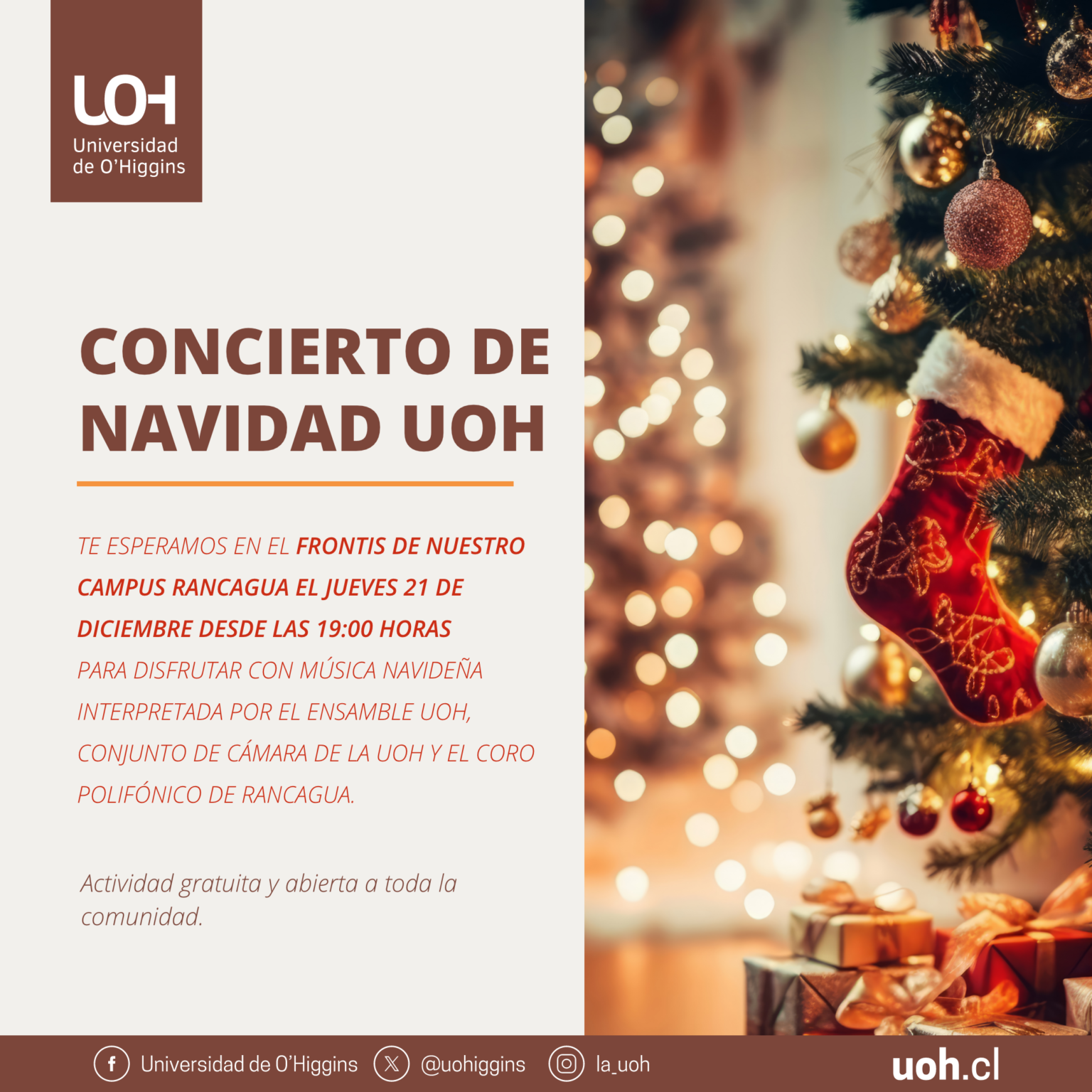 En el frontis del Campus Rancagua, ubicado en plena Alameda de la capital regional, la Universidad de O?Higgins (UOH) realizará por primera vez un Concierto Navideño abierto a toda la comunidad regional y totalmente gratuito, el jueves 21 de diciembre a partir de las 19.00 horas.