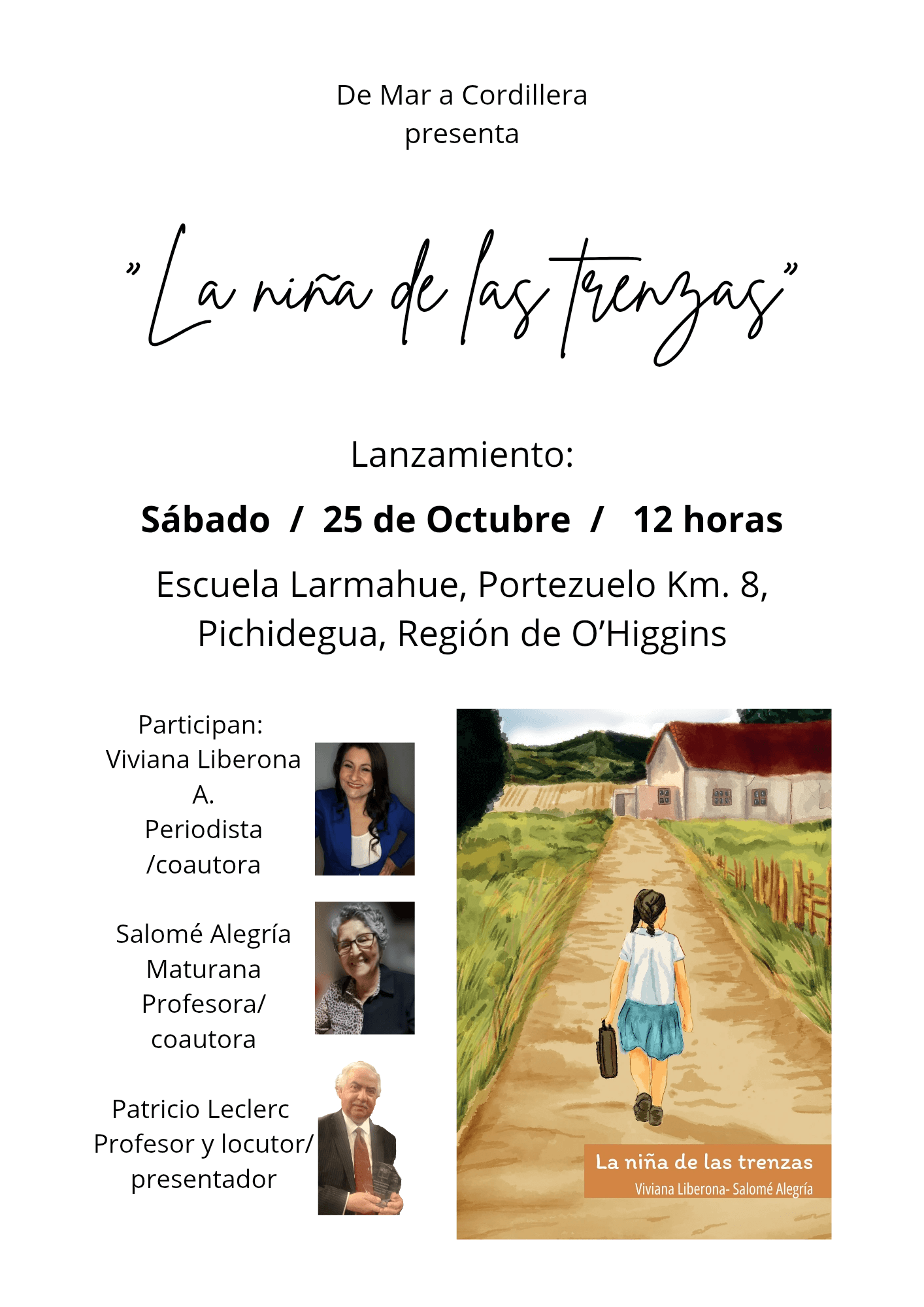 ??La Escuela de Larmahue en la comuna de Pichidegua se prepara para el evento literario del año, que configura el lanzamiento del libro "La niña de las trenzas", obra de la periodista Viviana Liberona, en coautoría con su madre, la profesora básica Salomé Alegría, protagonista de los cuentos, que busca rescatar historias del campo chileno.