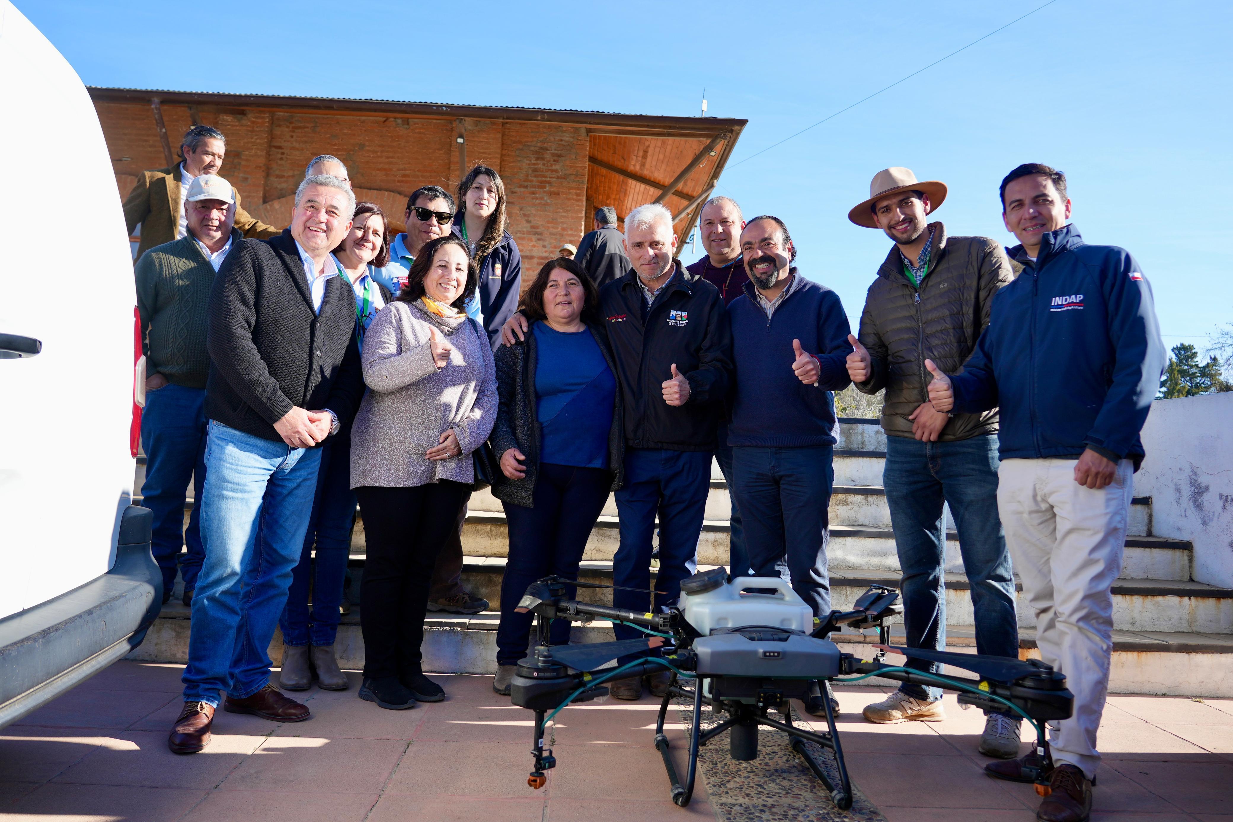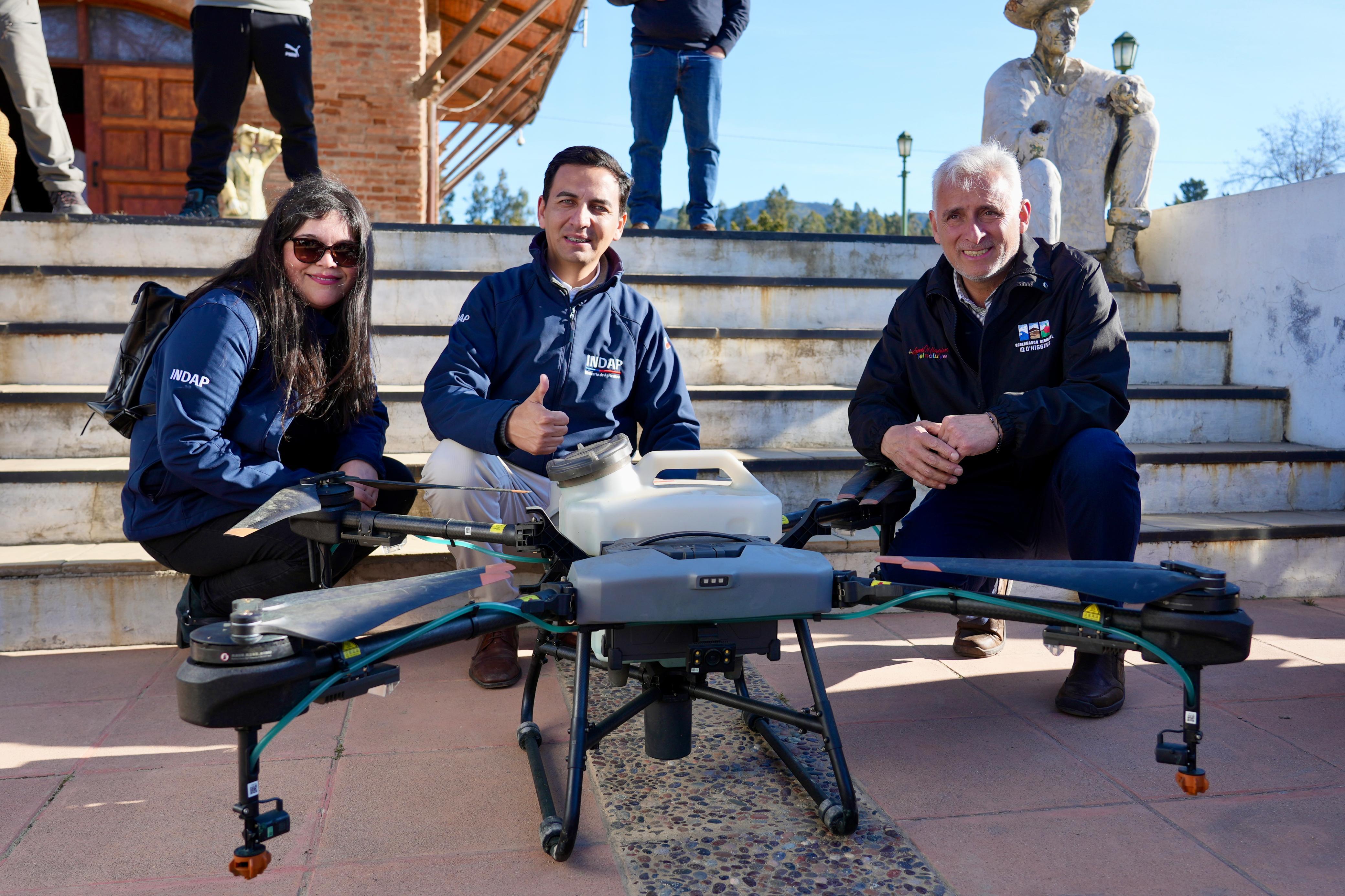 La jefa de Operaciones, Natalia López; el director regional de INDAP, Braulio Moreno; y el gobernador regional, Pablo Silva Amaya; destacaron la entrega de un dron para la aplicación de agroquímicos.