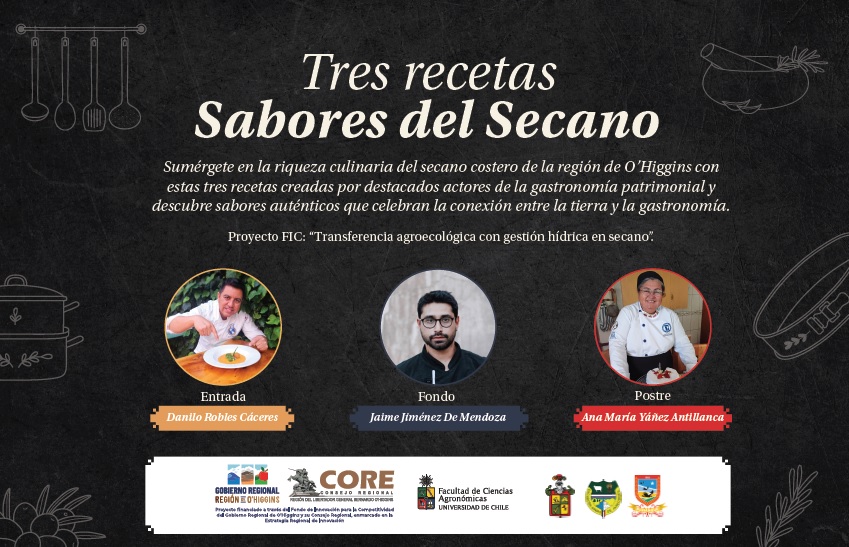 Otro de los ejes de impacto del proyecto ?Transferencia Agroecológica con gestión hídrica en secano? han sido las divulgaciones de las riquezas de alimentos únicos y patrimoniales del secano. Se han propuesto menús de la zona, elaborados por chefs; de gran relevancia mediática ha sido el ?menú del secano? y un ?recetario del secano?, este último editado como propuesta de fin de año por chefs y cocineros de la zona. Junto a ello, se han realizado intervenciones urbanas de cocinas en vivo en plazas y sitios públicos en la Región de O´Higgins, como en el Centro Cultural de Lolol y su Plaza, lugares donde se han reivindicado preparaciones antiguas, sanas y con alimentos perdidos en la memoria popular de los lugareños. Quínoa, chícharos, cochayuyos, garbanzos, pescados y mariscos han sido parte de los protagonistas en estas actividades.