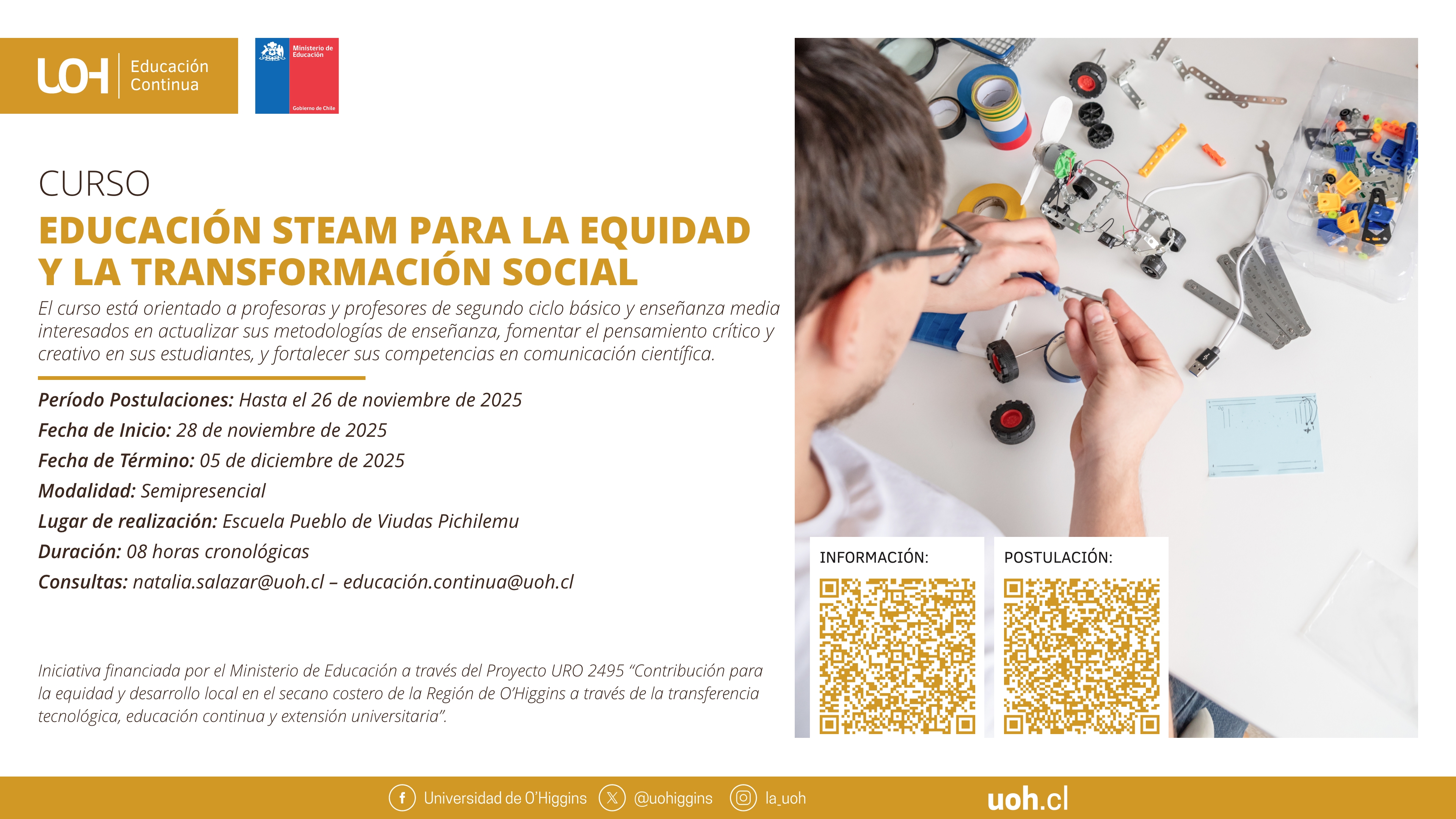 La Universidad de O?Higgins, a través de Educación Continua, invita a profesoras y profesores de la provincia de Cardenal Caro en la Región de O?Higgins a participar en el curso de formación continua ?Educación STEAM para la Equidad y la Transformación Social?, dirigido a docentes de segundo ciclo básico y enseñanza media.